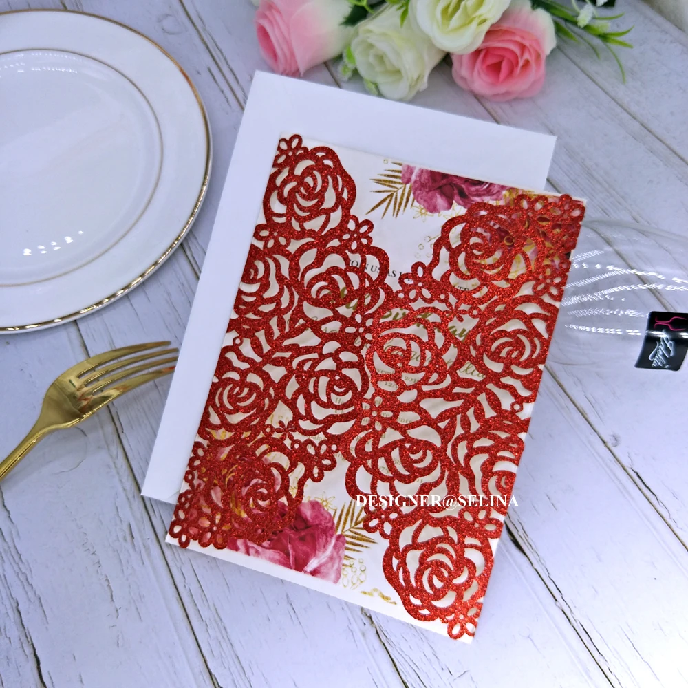 Red Glitter Laser Cut Wedding Invitation 30 Color Rose Sprinkle Fold Invitations For Birthday Quinceanera Invites With Envelope Aliexpress Home Garden